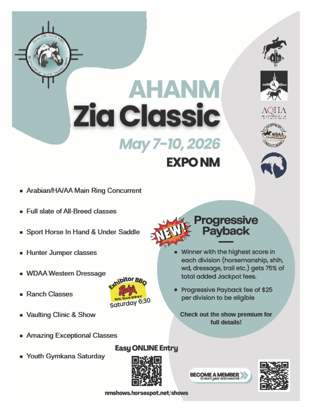 Zia Classic Thursday, May 7, 2026 7:00 AM Sunday, May 10, 2026 6:00 PM Arabian Horse Association of New Mexico P.O. Box 25541 Albuquerque, NM 87125-5541 United States (map) Google Calendar ICS